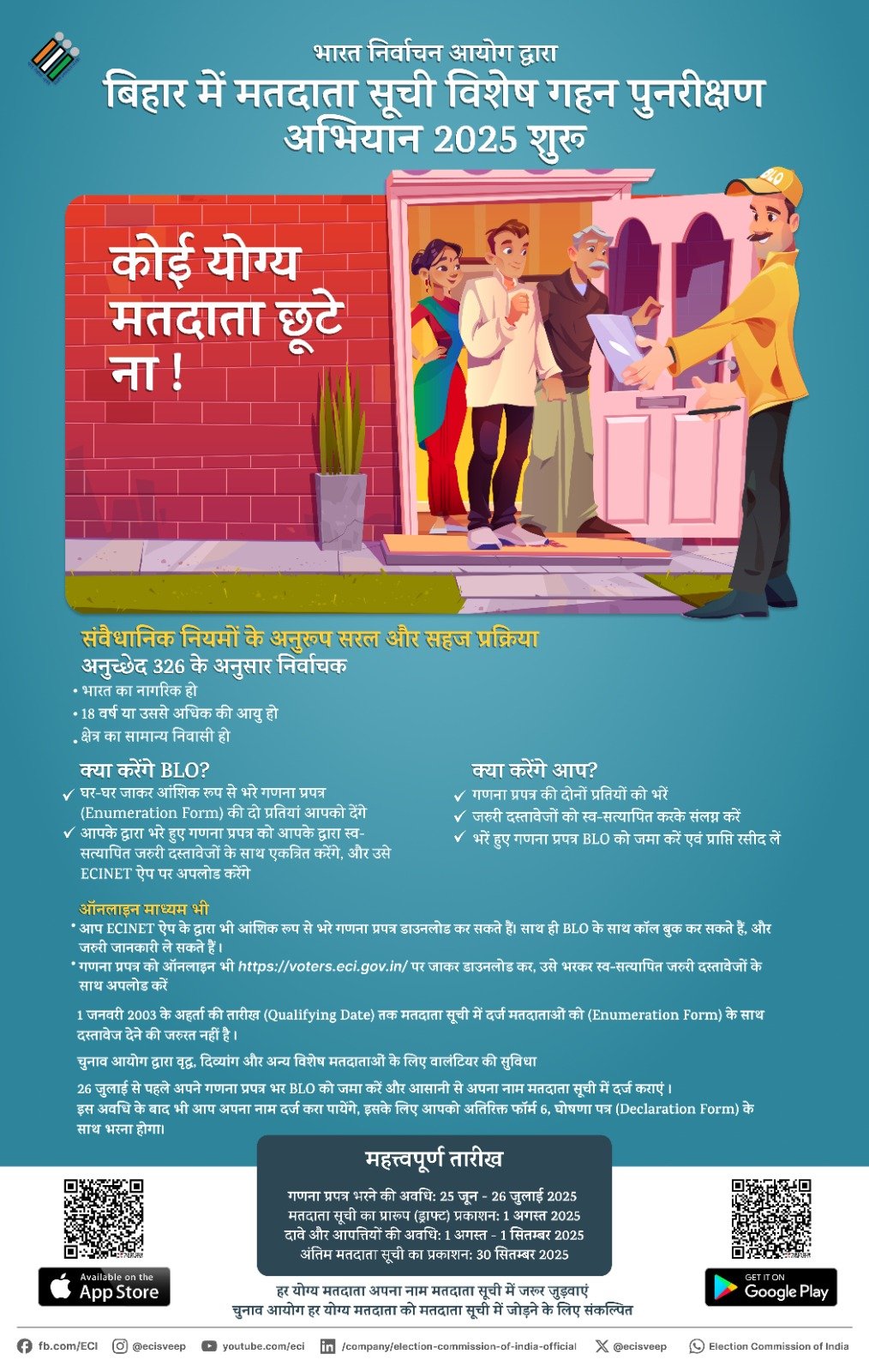 Bihar Election : बिहार चुनाव 2025 से पहले चुनाव आयोग ने आज से मतदाता सूची का विशेष सघन पुनरीक्षण अभियान शुरू कर दिया है। यह अभियान 26 जुलाई तक चलेगा। इसे मतदाता सूची से जुड़ी गड़बड़ियों को पूरी तरह खत्म करने की दिशा में चुनाव आयोग का बड़ा कदम बताया गया है। इसको लेकर बिहार के 5,74,07,022 पंजीकृत मतदाताओं के मोबाइल नंबर पर एसएमएस भेजे जा रहे हैं।