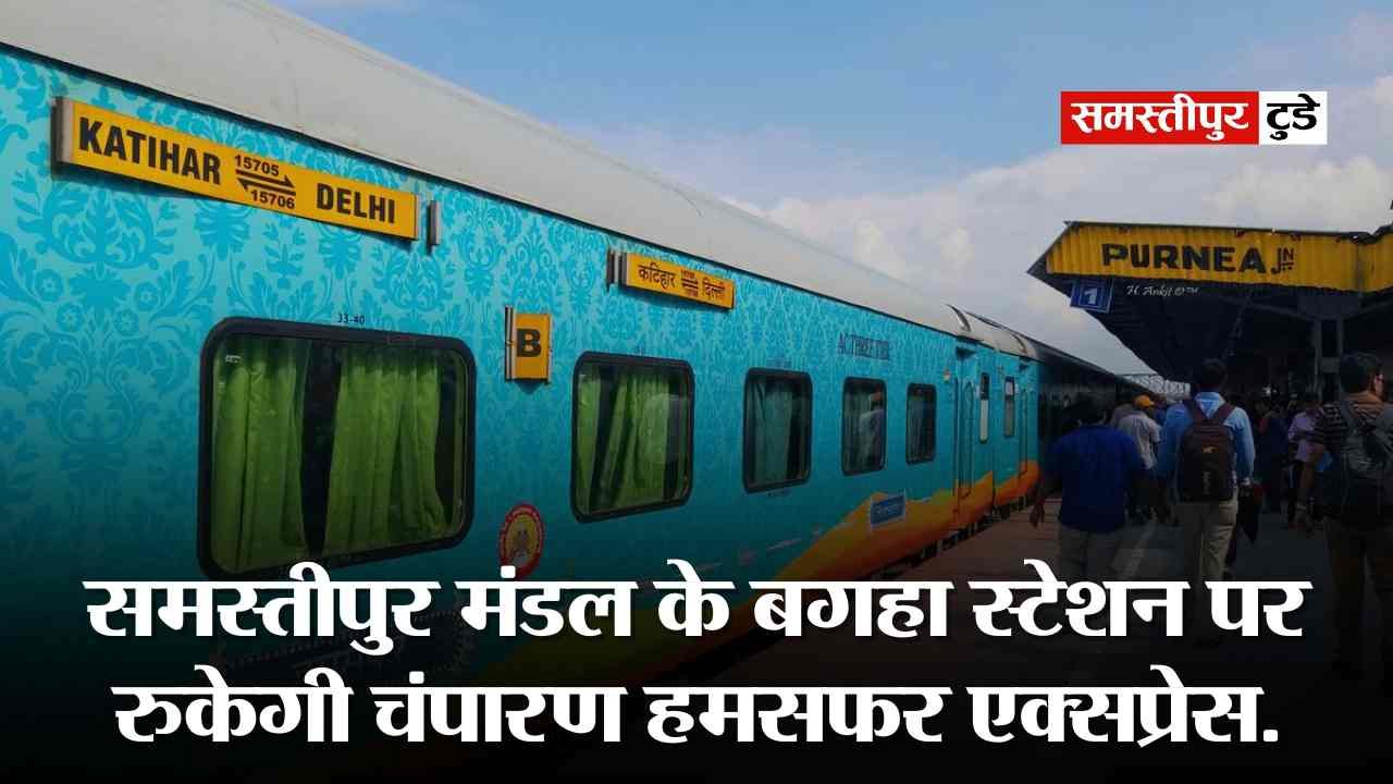 यात्रियों के लिए राहत भरी खबर है। समस्तीपुर मंडल से गुजरने वाली कटिहार- दिल्ली- कटिहार चंपारण हमसफर एक्सप्रेस अब बगहा स्टेशन पर भी ठहरेगी।