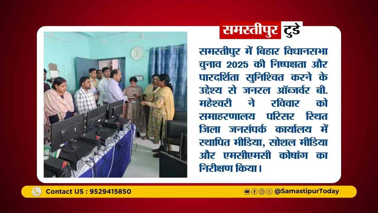 समस्तीपुर में बिहार विधानसभा चुनाव 2025 की निष्पक्षता और पारदर्शिता सुनिश्चित करने के उद्देश्य से जनरल ऑब्जर्वर बी. महेश्वरी ने रविवार को समाहरणालय परिसर स्थित जिला जनसंपर्क कार्यालय में स्थापित मीडिया, सोशल मीडिया और एमसीएमसी कोषांग का निरीक्षण किया।